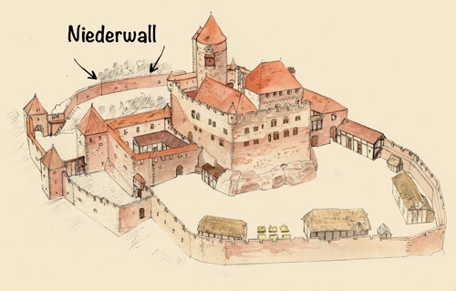 Am Fuß der Schildmauer befand sich ein Wasserbecken, das durch das von den Wehrgängen abfließende Regenwasser gespeist wurde.